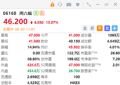 6月30日消息,港股周六福早盘拉升,现涨超15%,该股上周大涨超67%。