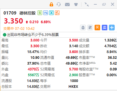 智通财经APP获悉,德林控股(01709)高开逾6%,截至发稿,涨6.69%,报3.5港元,成交额2167.55万港元。