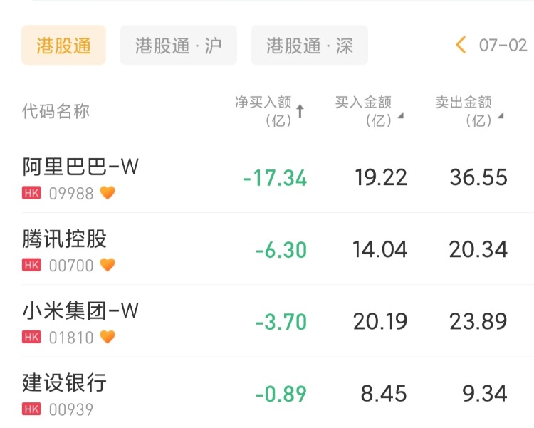 阿里巴巴-W、腾讯控股、小米集团-W分别遭净卖出17.34亿港元、6.3亿港元、3.7亿港元。