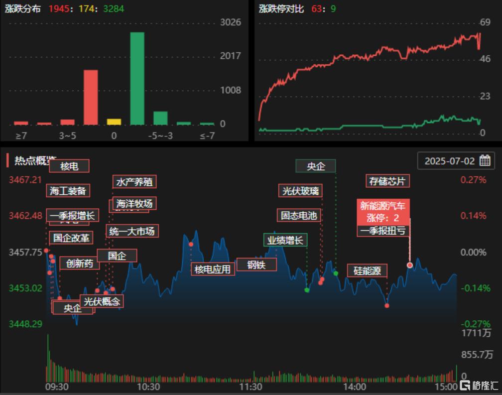 7月2日,3200多只个股下跌,近2000只个股上涨,63只个股涨停,9只个股跌停。市场热点聚焦核电、海工装备、水产养殖、光伏、钢铁等板块。