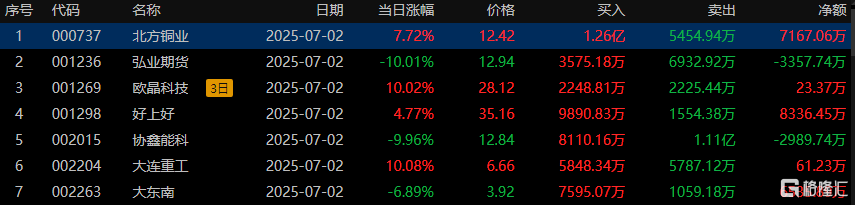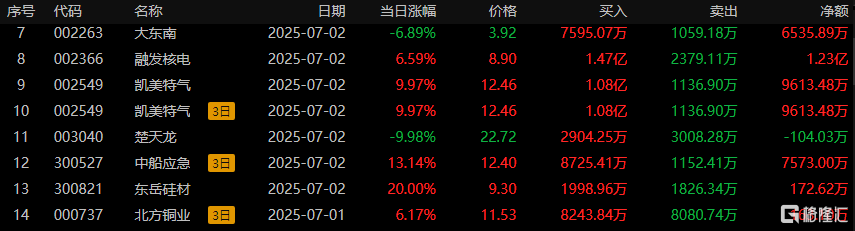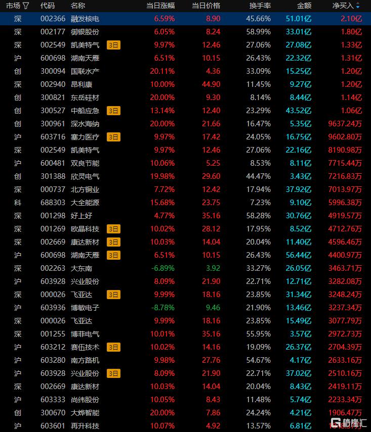 在龙虎榜中,涉及深股通专用席位的个股有10只,净买入融发核电1.23亿元、凯美特气9613.48万元、好上好8336.45万元、北方铜业7176.06万元、大东南6535.89万元,净卖出弘业期货3357.74万元、协鑫能科2989.74万元。