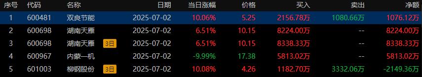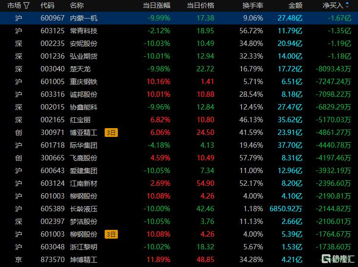 龙虎榜单日净卖出额前三为内蒙一机、常青科技、安妮股份,分别为1.67亿元、1.35亿元、1.19亿元。
