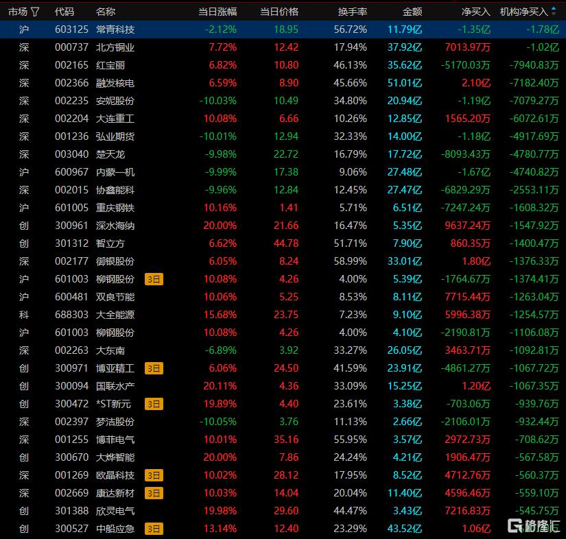 龙虎榜中涉及机构专用席位的个股中,当日净卖出额前三为常青科技、北方铜业、红宝丽,分别为1.78亿元、1.02亿元、7940.83万元。