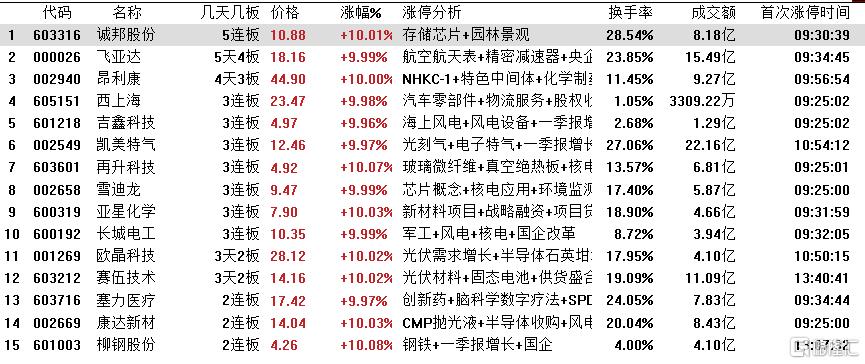 高位股上,存储芯片个股诚邦股份5连板,航空航天飞亚达5天4板,医药股昂利康4天3板、塞力医疗2连板,海上风电吉鑫科技3连板,光伏相关再升科技3连板、欧晶科技3天2板、赛伍技术3天2板,钢铁柳钢股份2连板。