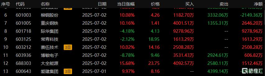 成都系:净买入国联水产5352万元、御银股份3954万元、双良节能2004万元、秀强股份1959万元、重庆钢铁1013万元,净卖出际华集团5083万元、长龄液压583万元