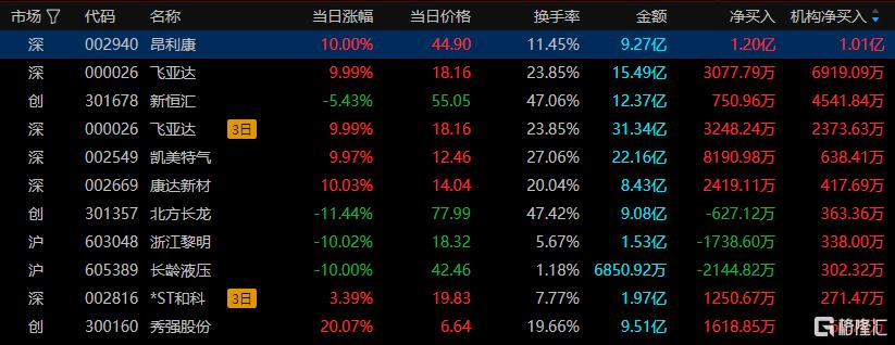 龙虎榜中涉及机构专用席位的个股中,当日净买入额前三为昂利康、飞亚达、新恒汇,分别为1.01亿元、6919.09万元、4541.84万元。