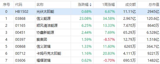 港股太阳能光伏板块走强,信义能源涨超23%,凯盛新能涨超9%,协鑫新能源涨超2%。