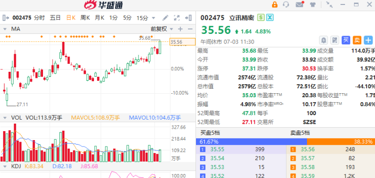 截至3日午间收盘,立讯精密涨4.83%报35.56元,总市值达到了2579亿元。