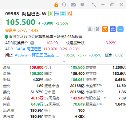 智通财经APP获悉,阿里巴巴-W(09988)跌超4%,截至发稿,跌3.56%,报105.5港元,成交额132.6亿港元。