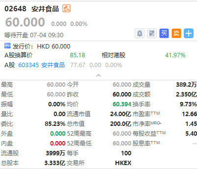 华盛资讯07月04日讯,港股安井食品今日挂牌,股价平开,报60.00港元/股,最新总市值200亿港元。该股此前公开发售获获44.2倍认购,一手中签率70%。