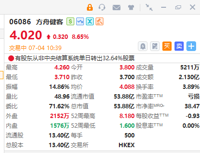 方舟健客(06086)早盘涨超8%,截至发稿,涨8.65%,报4.02港元,成交额2.13亿港元。