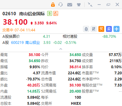 南山铝业国际(02610)再涨超9%,截至发稿,涨9.64%,报38.1港元,成交额2119万港元。