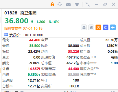 华盛资讯07月04日讯,港股富卫集团正在暗盘交易中,截至发稿跌3.16%,报36.8港元/股,中签一手账面浮亏120港元,最新总市值超467亿港元。该股预计将于7月7日正式挂牌上市,配售结果将于今日晚间披露。