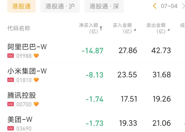阿里巴巴-W、小米集团-W、腾讯控股分别遭净卖出14.87亿港元、8.13亿港元、1.74亿港元。