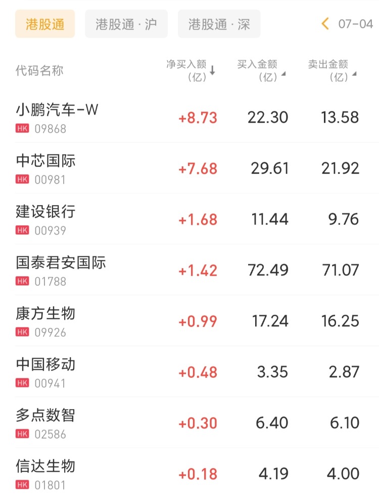 小鹏汽车-W、中芯国际、建设银行分别获净买入8.73亿港元、7.68亿港元、1.68亿港元;
