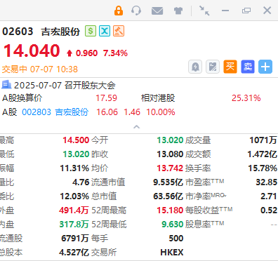 智通财经APP获悉,吉宏股份(02603)涨超7%,公司A股涨停。截至发稿,涨7.34%,报14.04港元,成交额1.472亿港元。