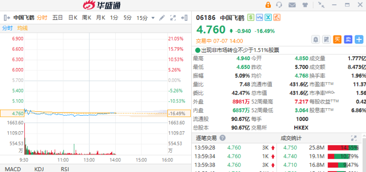 受上半年业绩预计下滑影响,港股上市公司中国飞鹤(6186.HK)股价大跌。