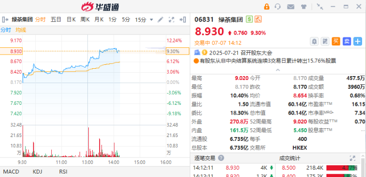 7月7日,绿茶集团(06831)午后一度涨超10%,高见8.99港元再创上市新高。截至发稿,涨9.3%,报8.93港元,成交额3960万港元。