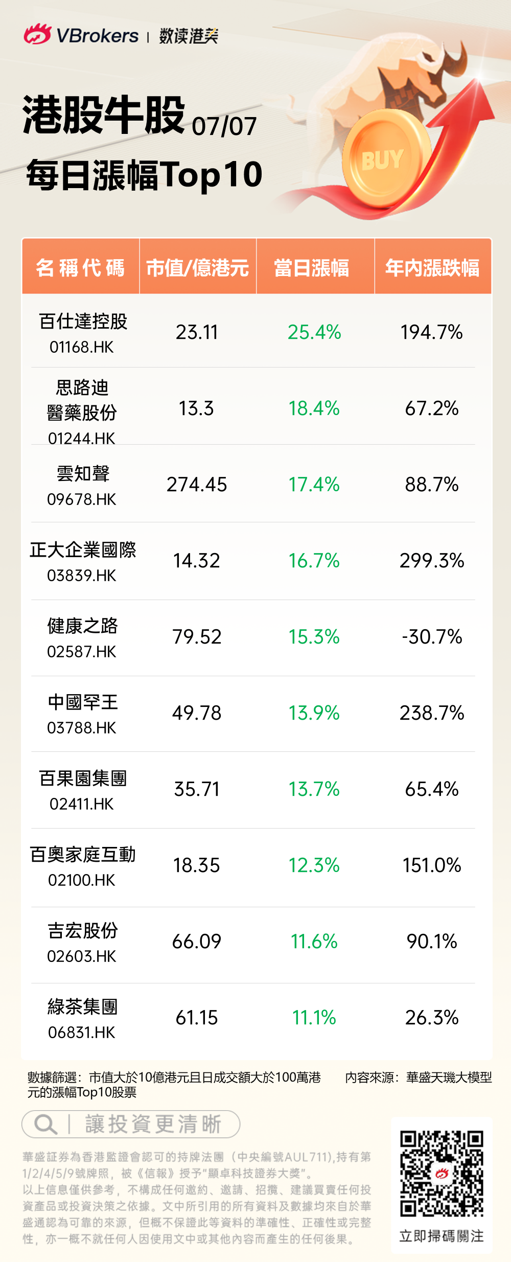 發仔统计了每日港股涨幅Top10,具体名单如下: