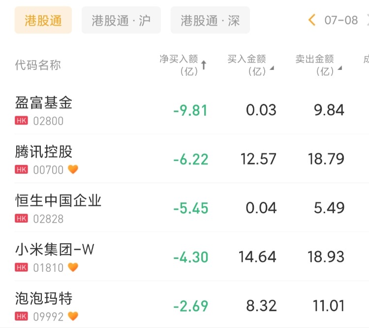 盈富基金、腾讯控股、恒生中国企业分别遭净卖出9.81亿港元、6.22亿港元、5.45亿港元。