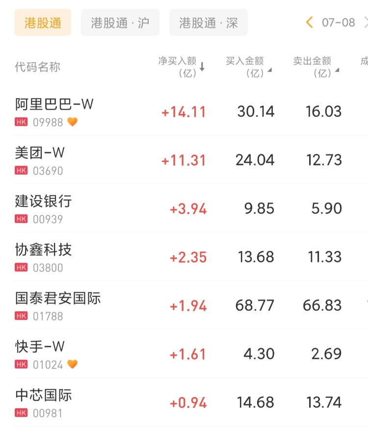 阿里巴巴-W 、美团-W 、建设银行分别获净买入14.11亿港元、11.31亿港元、3.94亿港元;
