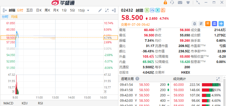 7月9日,越疆(02432)早盘一度涨超7%,截至发稿,涨4.74%,报58.5港元,成交额1.273亿港元。