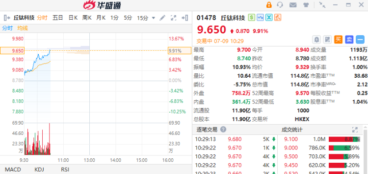 7月9日,丘钛科技(01478)早盘持续走强,截至发稿,涨9.91%,报9.65港元,成交额1.113亿港元。