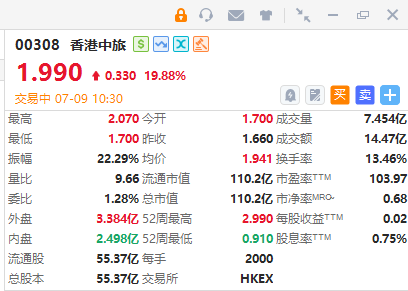 香港中旅再涨近20%,年内股价实现翻倍。截至发稿,涨19.88%,报1.99港元,成交额14.47亿港元。