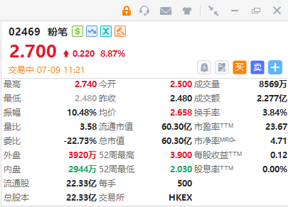 智通财经APP获悉,粉笔涨超8%,截至发稿,涨9.68%,报2.70港元,成交额2.277亿港元。