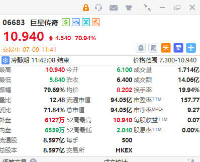 智通财经APP获悉,巨星传奇(06683)午前涨超70%,截至发稿,涨70.94%,报10.94港元,成交额14.06亿港元。