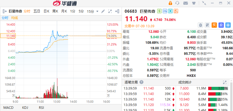 “周同学”IP的幕后推手是“周杰伦概念股”巨星传奇(06683.HK)。7月9日早盘,公司港股股价一度大涨超90%,截至发稿,涨幅为70%左右。