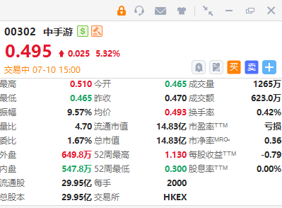 智通财经APP获悉,中手游(00302)一度涨超8%,截至发稿,涨5.32%,报0.495港元,报623万港元。
