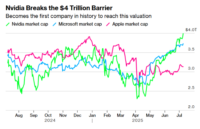 “AI芯片霸主”称号的英伟达股价在周三再创历史新高并且一举成为全球金融历史上首家市值达到4万亿美元的公司,巩固了其在全球金融市场的最核心地位。