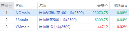美股三大指数期货周四盘前微跌,纳指期货 $NQmain 涨0.08%,标普500期货 $ESmain 涨0.04%,道指期货 $YMmain 跌0.02%。