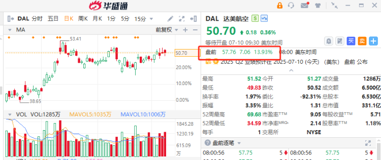 达美航空Q2净利润21.3亿美元大超预期,公司股价盘前涨超13%;恢复全财年业绩指引,预计全财年调整后每股收益5.25美元-6.25美元。