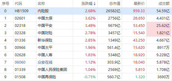 内险股早盘普涨,截至发稿,中国太保(02601)涨3.62%,报28.65港元;中国平安(02318)涨3.48%,报53.45港元;新华保险(01336)涨2.85%,报43.25港元。