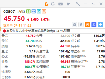 智通财经APP获悉,西锐(02507)再涨超8%,截至发稿,涨8.67%,报45.75港元,成交额1.419亿港元。