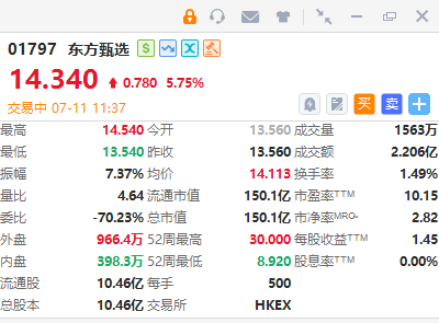 东方甄选(01797)涨超5%,截至发稿,涨5.75%,报14.34港元,成交额2.206亿港元。