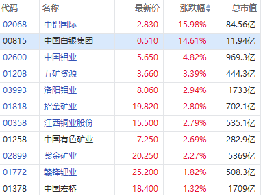 7月11日,有色板块表现强势,截至发稿,中铝国际涨近16%,中国白银集团涨超14%,中国铝业涨近5%,五矿资源涨超3%,洛阳钼业、招金矿业涨超2%。