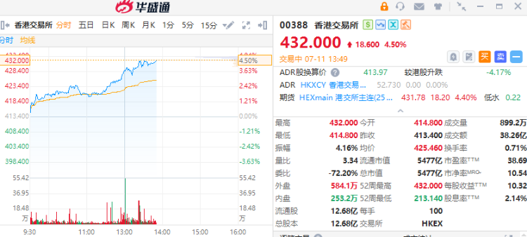 7月11日,港交所(00388)午后涨超4%,截至发稿,涨4.50%,报432港元,成交额38.26亿港元。