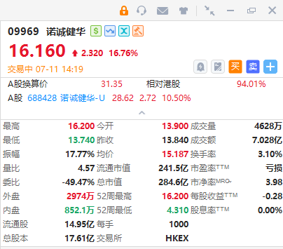 智通财经APP获悉,诺诚健华(09969)午后涨超16%,截至发稿,涨16.16%,报16.16港元,成交额7.028亿港元。