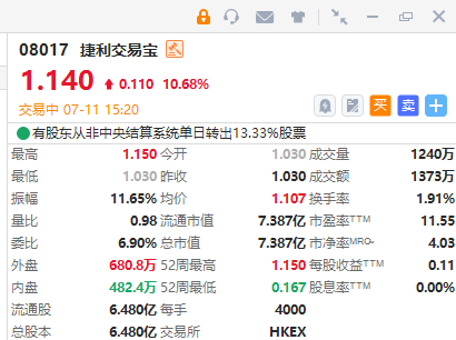 捷利交易宝涨超10%,本周累计涨幅已超40%。截至发稿,涨10.68%,报1.14港元,成交额1373万港元。
