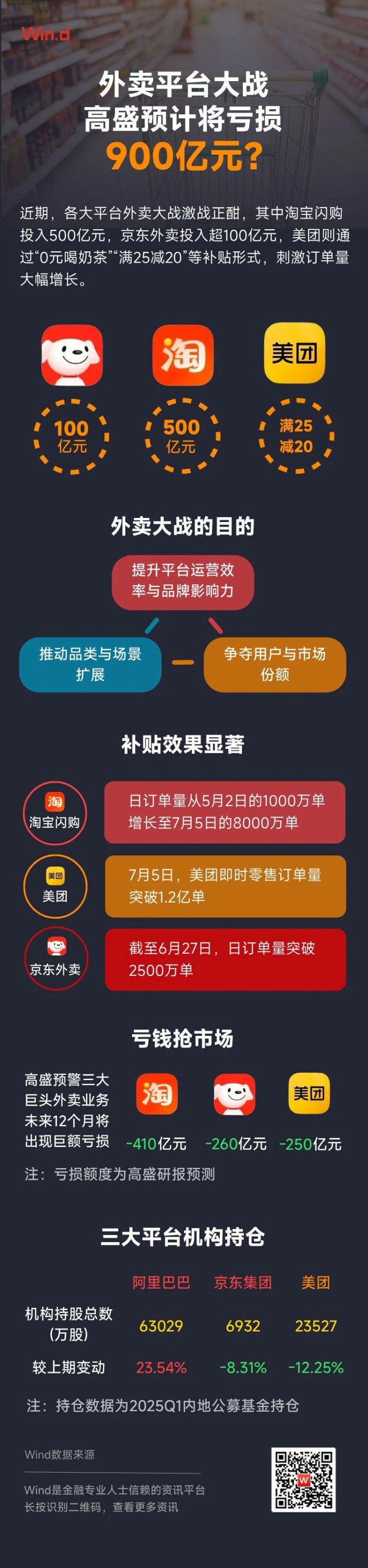高盛预计,此轮外卖配送大战或持续更长时间,与此同时,各家平台外卖业务也将出现巨额亏损,高盛研报表示,仅2025Q2这三家在本领域的投入就达到250亿元,同时在202507-202606的这12个月内,阿里外卖业务会亏损410亿元,京东亏损260亿元,美团EBIT减少250亿元。