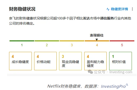 Netflix的财务健康评分为3.18,稳居「出色」级别,反映其强劲的盈利能力、充裕的现金流及出色的财务纪律。InvestingPro还指出,Netflix的Piotroski评分达到了完美的9分,显示其基本面异常稳健。
