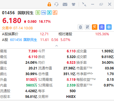 国联民生(01456)盈喜后涨超16%,截至发稿,涨16.17%,报6.18港元,成交额9.818亿港元。