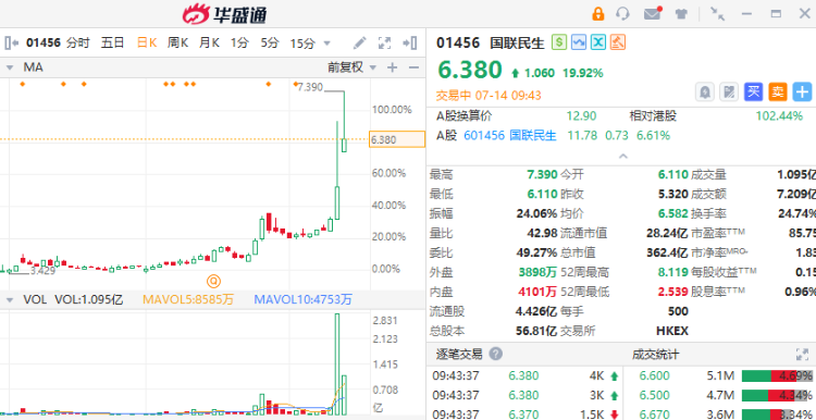 国联民生(01456)发盈喜后高开,股价一度上涨26.32%,现报6.72港元,成交额3.30亿港元。