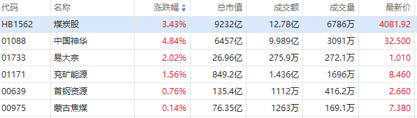 煤炭股早盘普涨,截至发稿,中国神华(01088)涨4.52%, 报4.84%,报32.5港元;兖矿能源(01171)涨1.56%,报8.46港元。