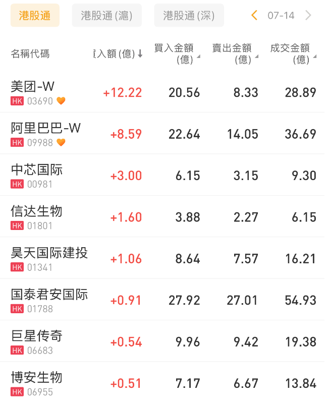 美团-W、阿里巴巴-W、中芯国际分别获净买入12.22亿港元、8.59亿港元、3.00亿港元。