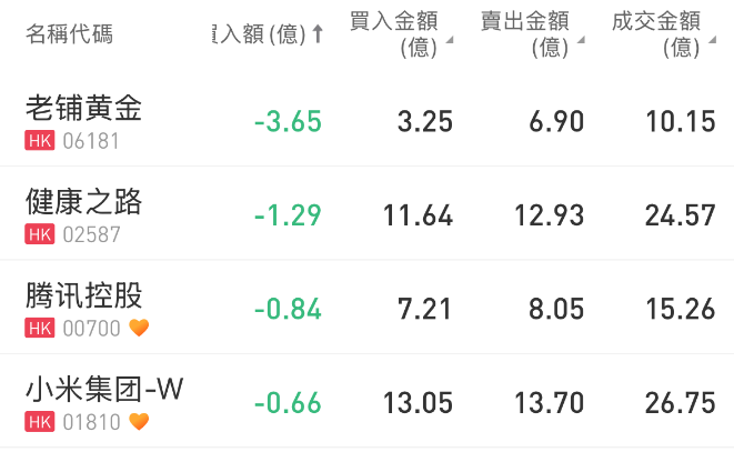 老铺黄金、健康之路、小米集团-W分别遭净卖出3.65亿港元、1.29亿港元、0.66亿港元。