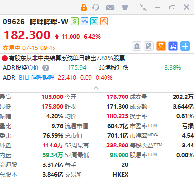 哔哩哔哩-W(09626)早盘涨超6%,截至发稿,涨6.42%,报182.3港元,成交额3.644亿港元。